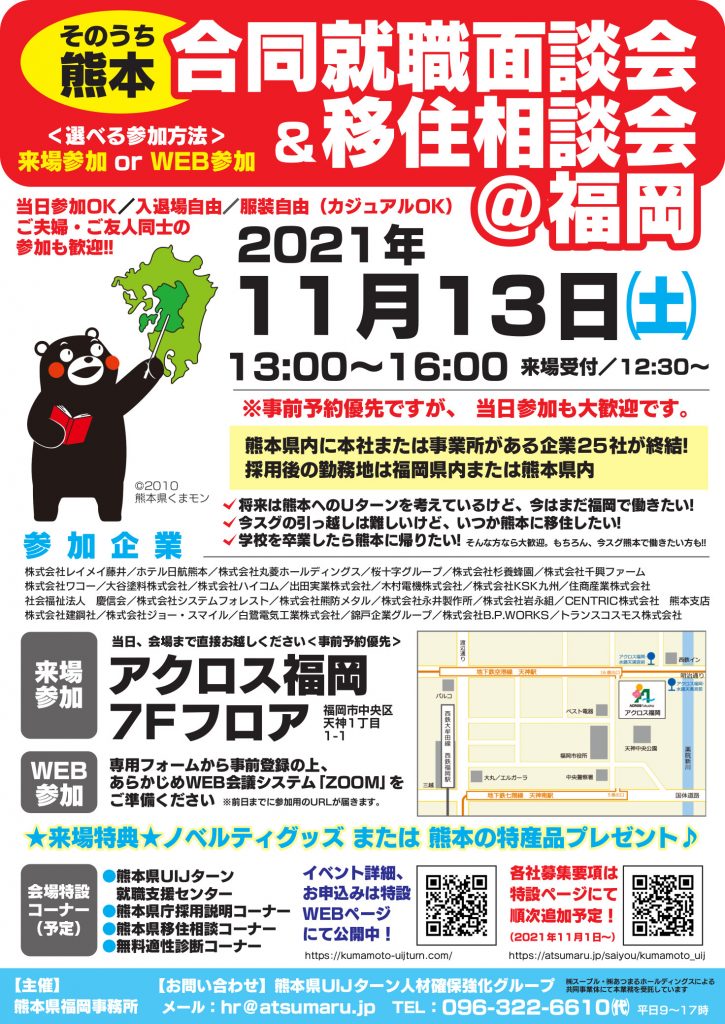 投稿者:staffkbm 2021年11月2日2021年11月2日 合同企業説明会に参加します(in福岡) 11月13日(土曜日)に、福岡県アクロス福岡 7階にて合同企業説明会に参加致します。 ご来場のほど、お待ちしております。